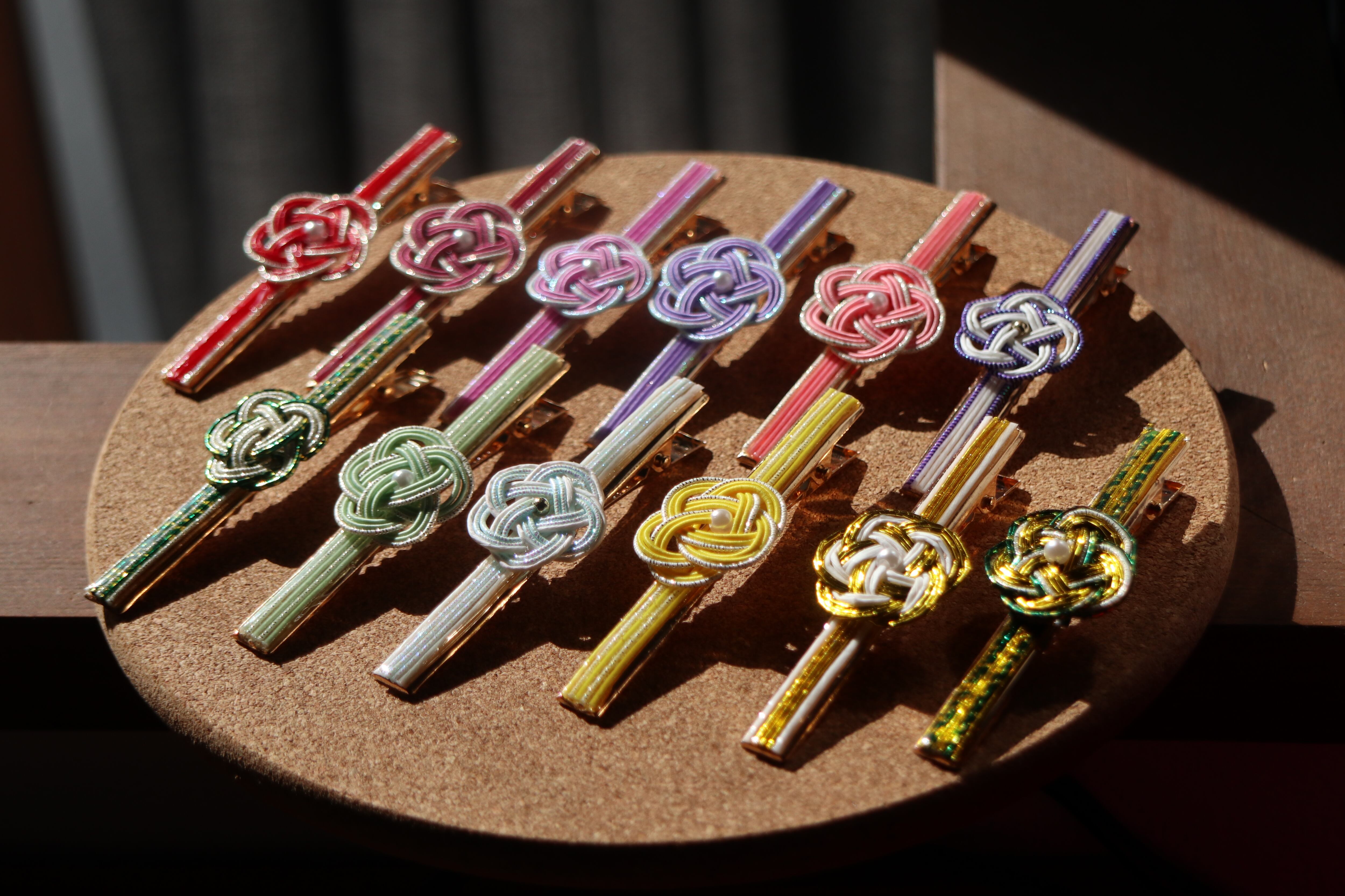 水引を使用した梅結びは、華やかさの中にも落ち着きがあり、舞台衣装はもちろん、着物でのお出かけにも合わせやすいデザインに仕上げました。