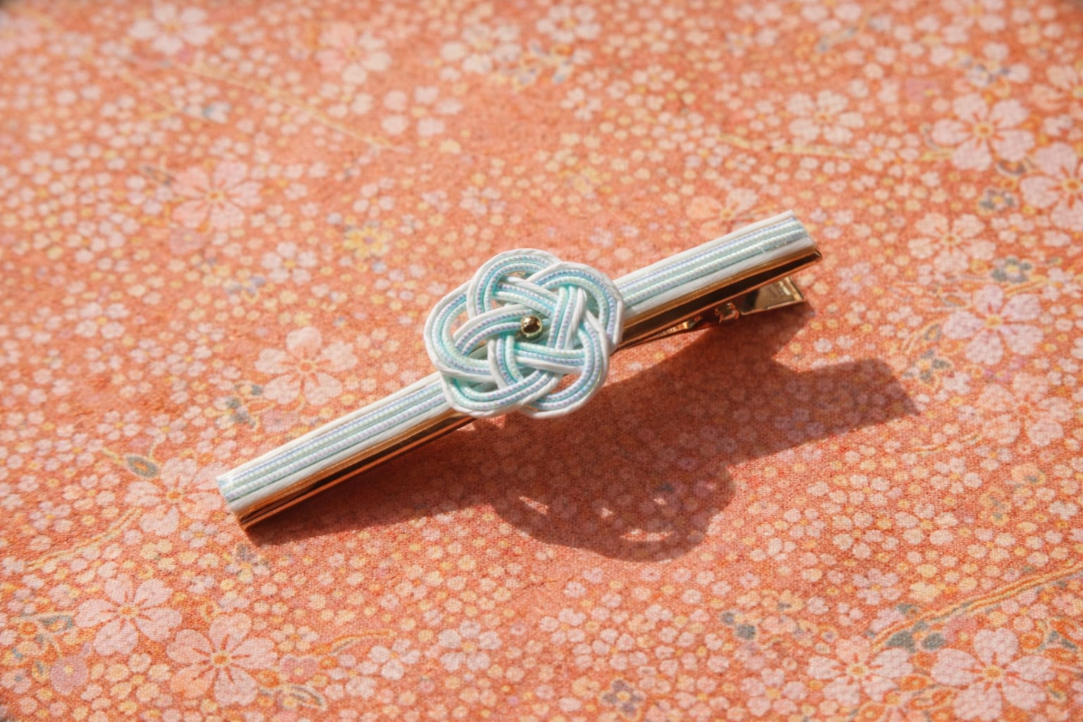 梅結びの中央には金色のビーズをあしらい、縁起の良さと上品さをプラスしました。