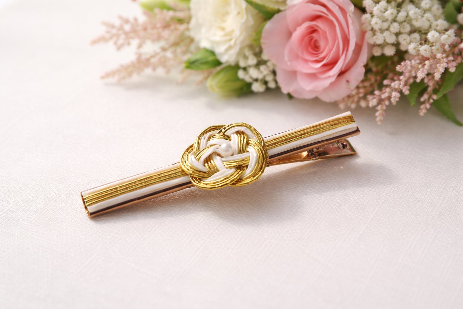 大衆演劇用 花ピン|水引梅結び(白×金)×ゴールドヘアクリップ