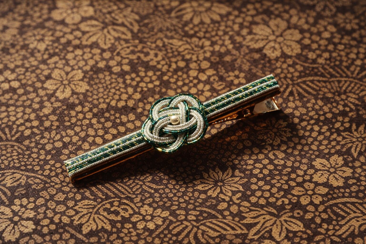 大衆演劇用 花ピン|水引梅結び(緑色ラメ×白)×ゴールドヘアクリップ
